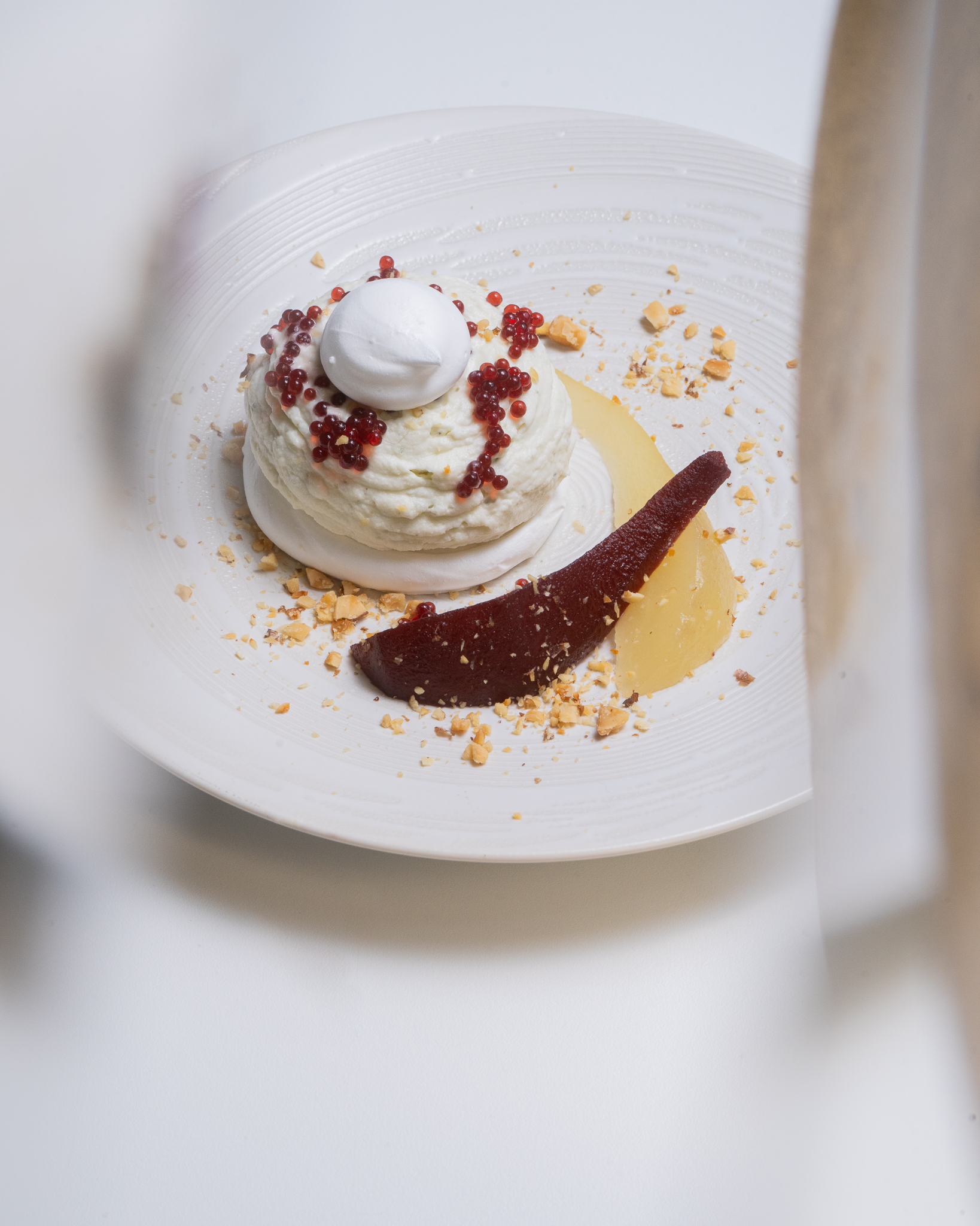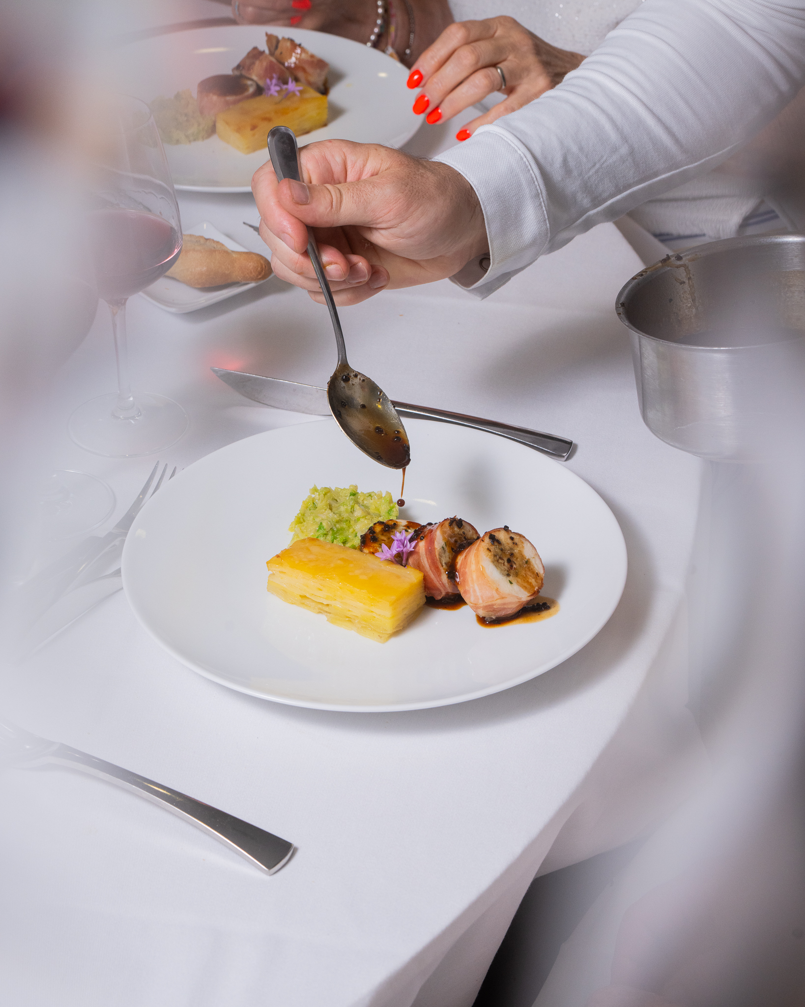 Apéritif & mises en bouches / Menu en 5 services (2 entrées, plat, fromage, dessert et mignardises) incluant accords mets & vins, softs, eaux et café.